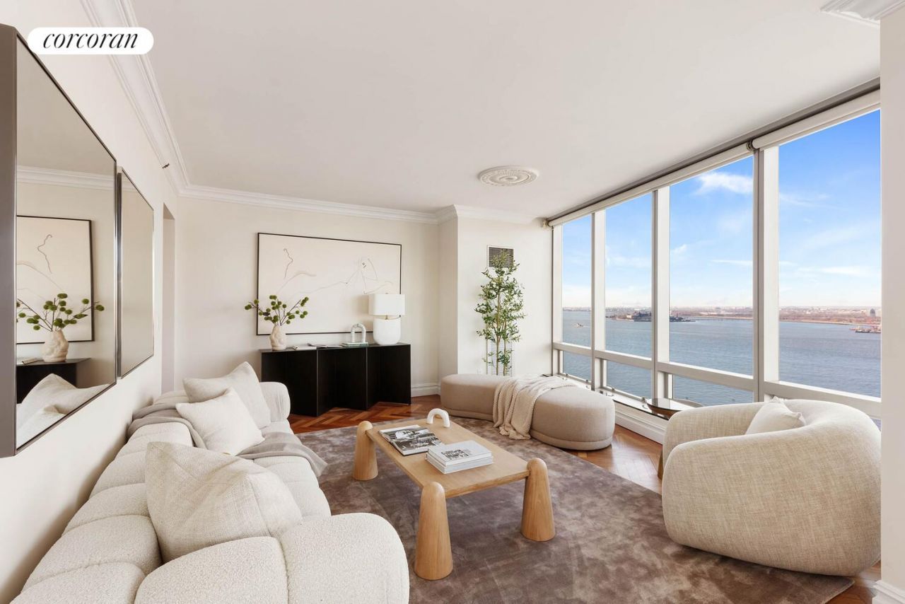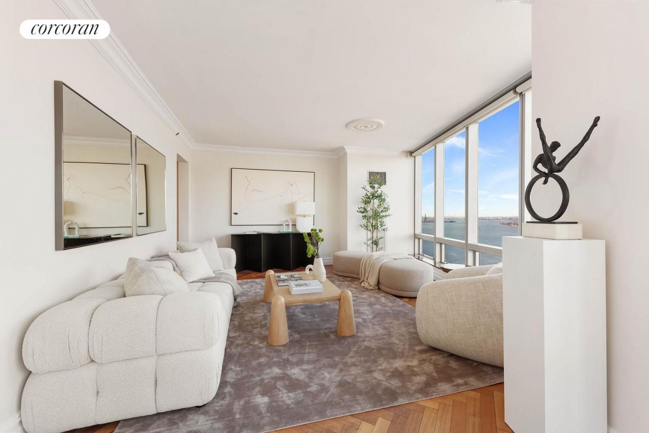 Nestled at The Ritz Carlton Residences, this elegant apartment boasts North and South exposures with stunning Hudson River views overlooking Battery Park City, the Statue of Liberty and Ellis Island, flooding the space with natural light throughout the day.