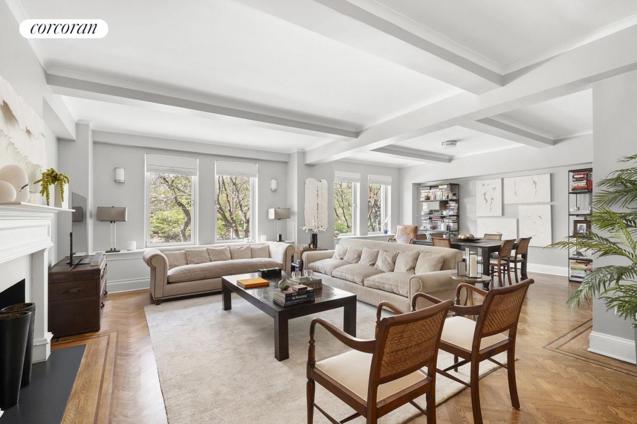 Upon entering, you are greeted by a gracious 17-foot wide entry foyer that sets the tone for the sophisticated living experience that awaits. The grand-sized living room and dining room feature high-beamed ceilings and elegant herringbone floors throughout, creating an inviting space ideal for both relaxation and entertaining. Large windows provide stunning views of Central Park, bringing the beauty of the outdoors into your home.