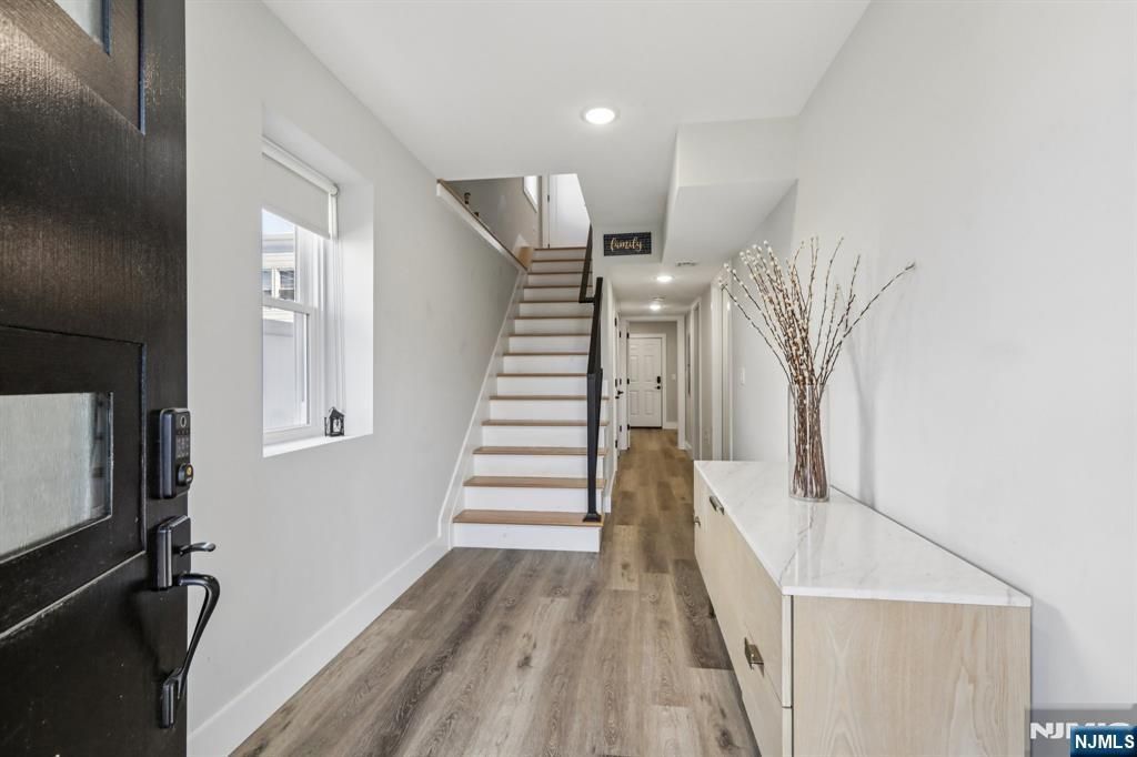 Beautifully maintained one-family duplex-style home featuring a 1-car garage and private driveway. This home offers 7 spacious rooms, including 4 bedrooms and 3.5 bathrooms, with thoughtful attention to detail throughout. The main level features a modern kitchen with quartz countertops, tiled backsplash, and stainless steel appliances, seamlessly flowing into the living and dining areas, with sliding doors leading to a private deck and balcony. The primary suite offers a private bath and generous closet space. The finished ground level includes a fourth bedroom, full bathroom, and a flexible office space with direct access to the backyard. Each unit enjoys its own private, fenced-in yard. Additional features include a 2-zone HVAC system with gas heat and central air. Conveniently located just 2"3 blocks from NYC bus service and PATH train access, making commuting simple and efficient. No HOA fees.