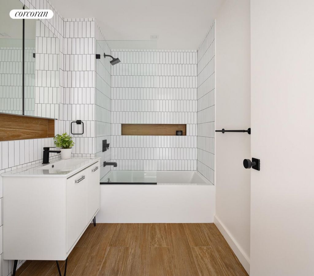 Kitchens feature white quartz countertops, and more than ample matte white cabinetry with custom smoked glass accent cabinets to meet all of your storage needs. The stainless-steel appliance package includes Beko refrigerators, and Frigidaire dishwashers, ranges, and vented microwaves above. Custom kitchen island bars built for three or even 4 stools are available in many units as well. Bathrooms are luxurious and spacious, featuring deep soaking tubs and rain showers with glass splash walls. The clean white subway tiles with black grout on the walls add a stylish touch, while the warm wood tiles on the floors create cohesive continuity with the rest of the home. Substantial, white vanities with under storage, wall to wall vanity mirrors, and custom inset shelving in the shower and above the vanity allow for sleek extra storage and display areas. Matte black hardware adds a cool, modern touch, while warm wood accents threaded throughout compliment and balance the picture. Zoned heating and cooling keep homes comfortable, eco-friendly, and economical, while in-unit combo Washer/Dryers and video intercom systems add convenience and security.