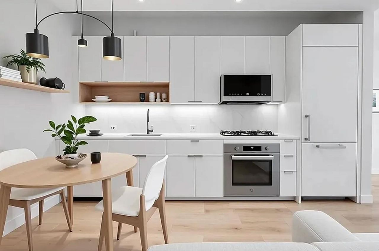 -Custom cabinetry and floating shelving provide elevated kitchen storage and aesthetics.