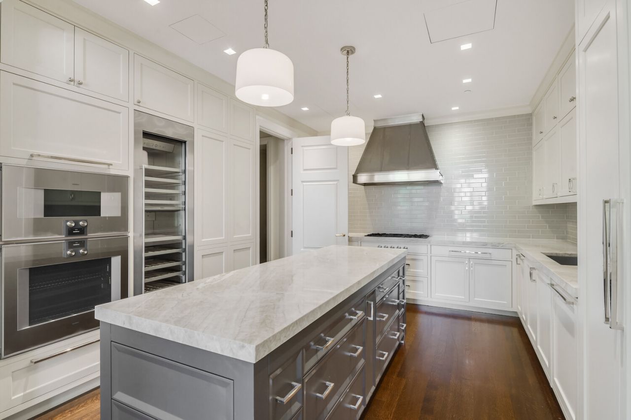 White Appalachian herringbone oak floors, stained walnut, run seamlessly through the public spaces. The chef's kitchen is beautifully appointed with custom shaker-style millwork, Brazilian quartzite countertops, Lefroy Brooks hardware, and Gaggenau appliances, including a vented range and wine refrigerator. A perfectly scaled dining area completes the entertaining experience.
