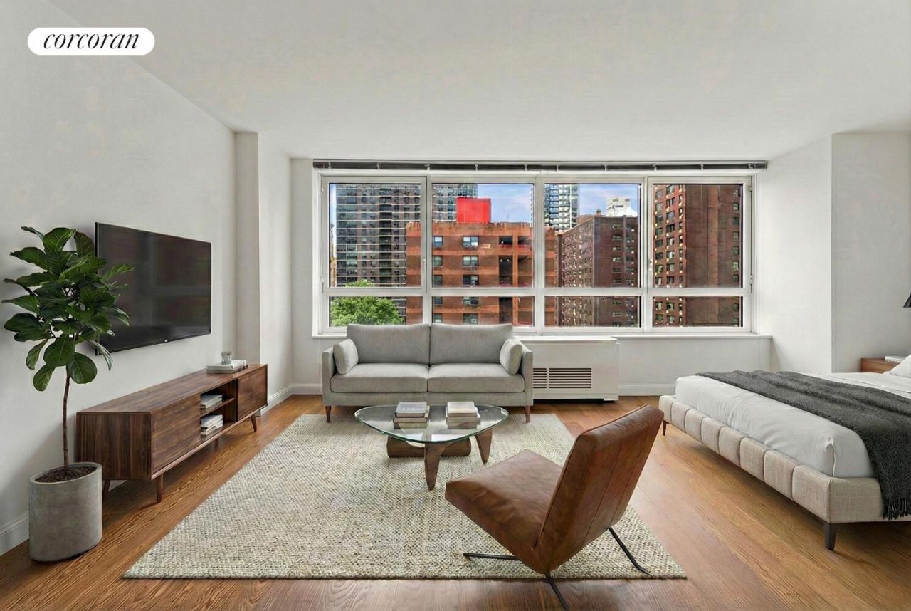 Welcome to Apartment 703, a beautifully renovated and oversized alcove studio offering a rare combination of open eastern exposure and lush, leafy views of Carnegie Park's private half-acre garden. Located on a high floor within one of the Upper East Side's most distinguished condominiums, this home is bathed in natural light through expansive picture windows that stretch across the main living space.