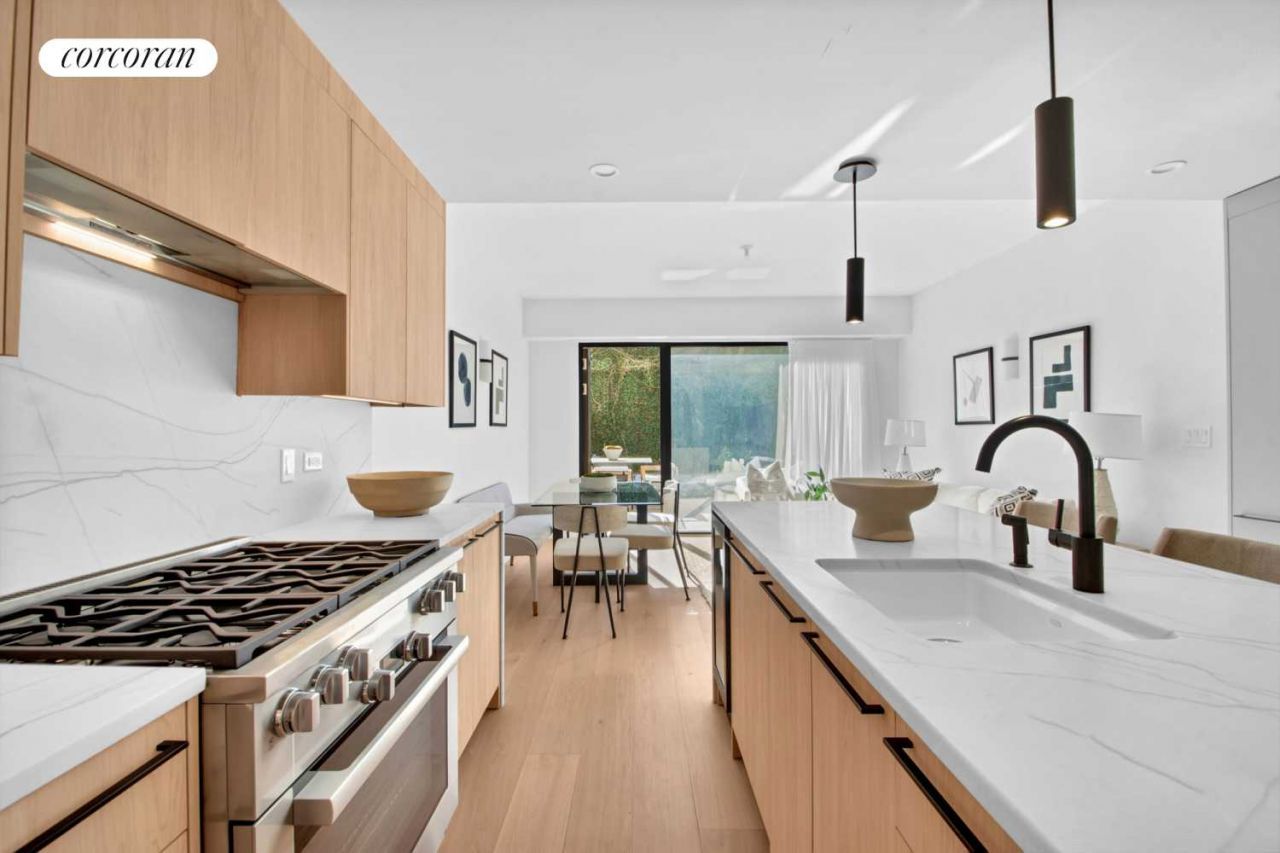 Upon entry, you're welcomed by a bright and airy entertaining level, with high ceilings, crisp plank PID white oak flooring, and oversized windows that let in a plethora of natural light. The chef's kitchen is a masterful blend of style and functionality, outfitted with fully integrated and paneled Miele appliances, six-burner gas range, including a wine fridge, vented hood, microwave & disposal. Custom Porcelanosa cabinetry, pantry, matte black Kohler fixtures, and a striking granite waterfall island with a matching single-slab backsplash that elevate the space. Flow seamlessly from the kitchen and dining area into the home's expansive private garden, a serene retreat with 30 feet of depth-ideal for al fresco dining and entertaining.