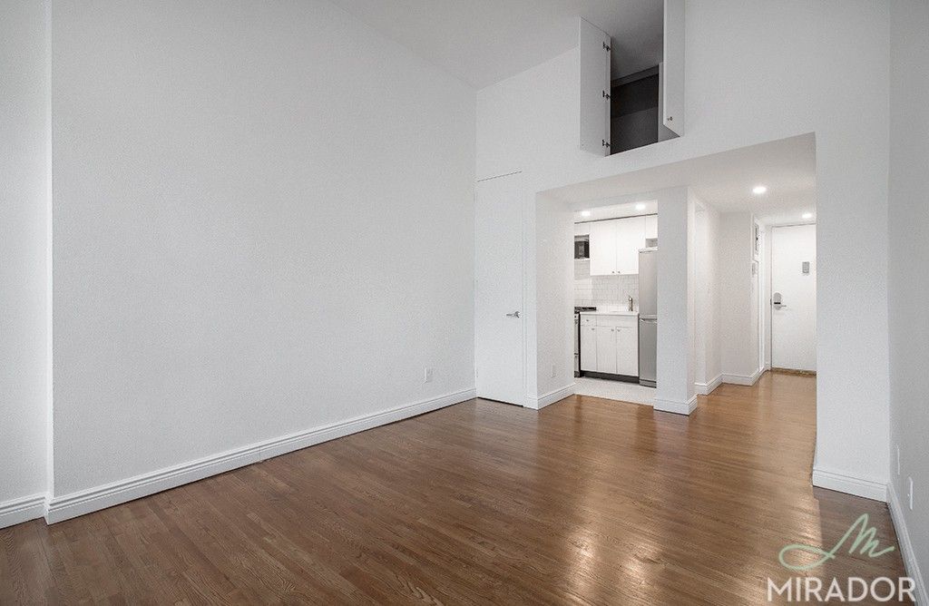 This gorgeous loft studio underwent a gut renovation to bring forth is loft home, with super high ceilings, massive windows, and storage! The kitchen has penny tile floors and stainless steel appliances. The bathroom has white subway tile walls, Restoration Hardware fixtures, and penny tile floors.