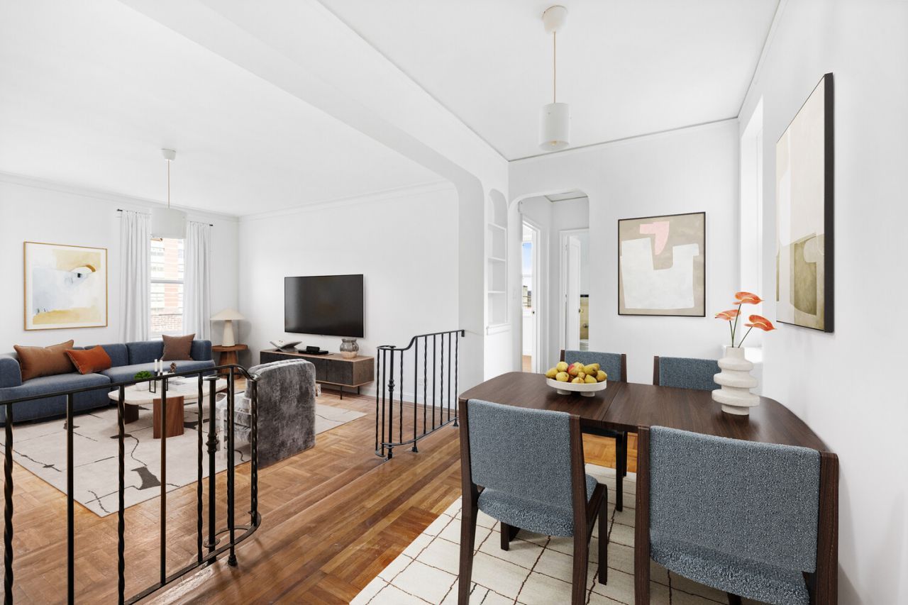 The spacious layout features a sunken living room and an elevated entry foyer, beautifully separated by an ornate wrought-iron Art Deco railing. The foyer is large enough to accommodate a home workstation or dining area, while arched doorways, built-in shelving, and striking Art Deco detailing throughout give the home classic New York charm.