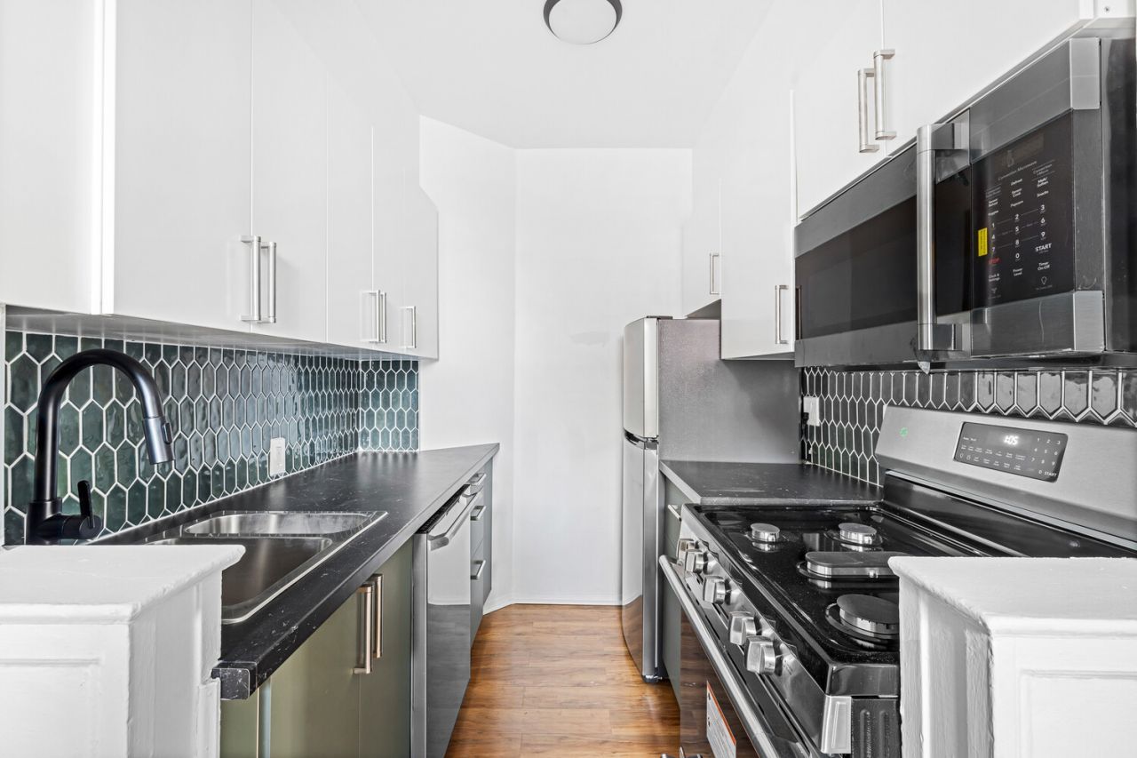The updated, modern kitchen is both stylish and functional, featuring stainless steel appliances, a rich green statement backsplash, and a charming dining nook. The generously sized bedroom easily fits a California King bed, and the apartment offers an impressive five closets for abundant storage.