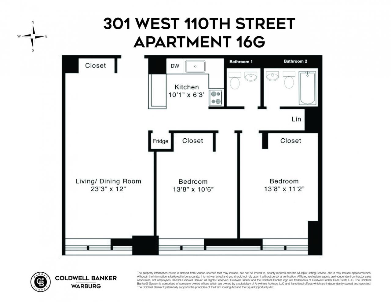 301 W 110th Street , Unit 16G, Manhattan, NY 10026.