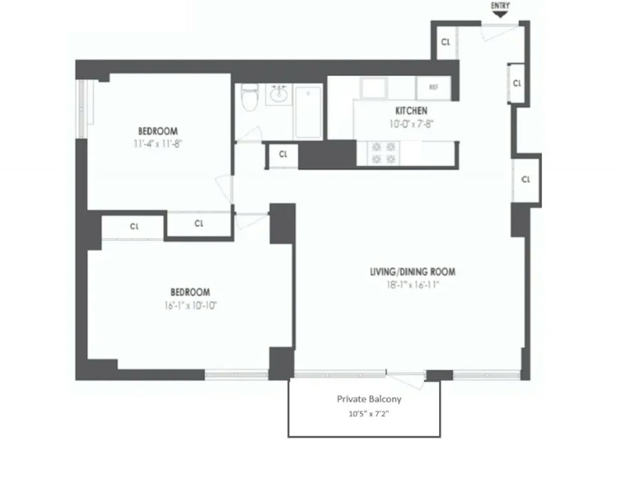 The living room spans an impressive 18' x nearly 17', providing generous space for both living and dining. The primary bedroom measures almost 16' x 11' with plenty of room to add additional closet space if desired. The second bedroom features stunning, direct Brooklyn Bridge views - a rare and charming feature at this price point. The bathroom layout also allows for potential expansion by incorporating the adjacent closet and a portion of the hallway.