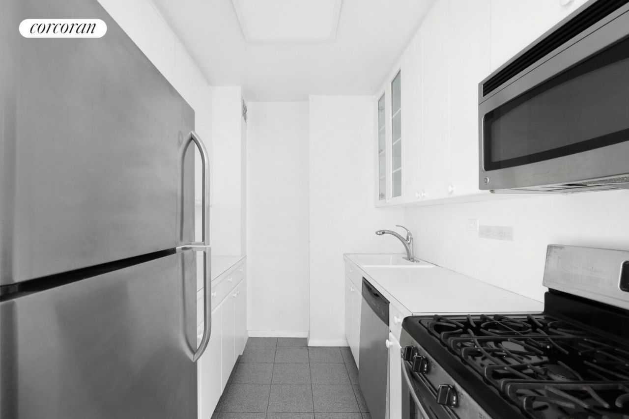 Residence 6F is a spacious alcove studio that offers abundant closet and storage space, along with a wall of windows that bathes the home in bright morning light and captures tranquil Central Park views. A generously scaled kitchen-rare for a studio-features full-sized stainless steel appliances, including a dishwasher and microwave. A separate sleeping alcove offers a welcome sense of privacy, creating a distinct and comfortable retreat within the home.