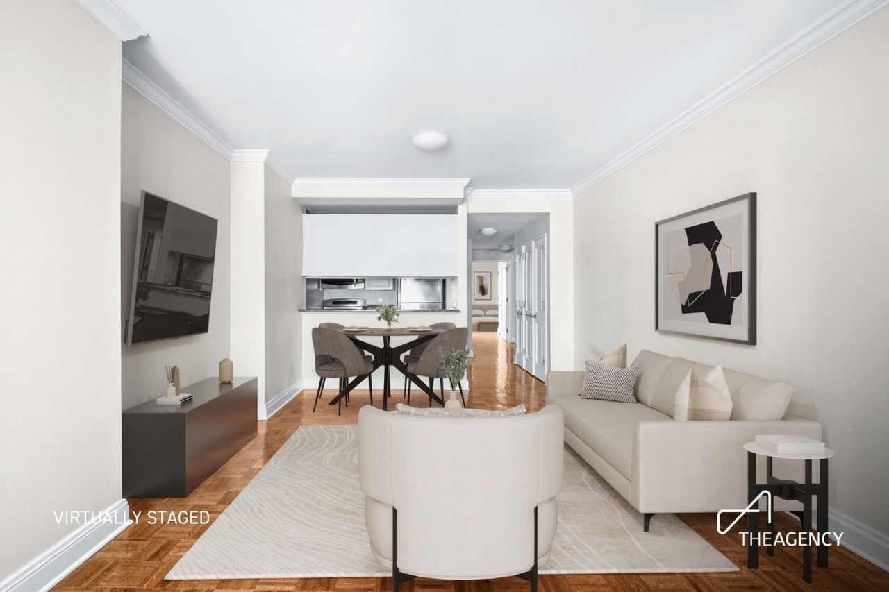 The living room is generously sized, featuring classic parquet floors, crown molding, and ample wall space that allows the room to be comfortably arranged for relaxing, dining, and entertaining. Large windows bring in consistent natural light and frame an open city outlook, giving the space an airy, comfortable feel throughout the day. The adjacent pass-through kitchen is efficient and thoughtfully laid out, with granite countertops, full-size stainless steel appliances, and ample cabinetry-well suited for everyday cooking and casual hosting.