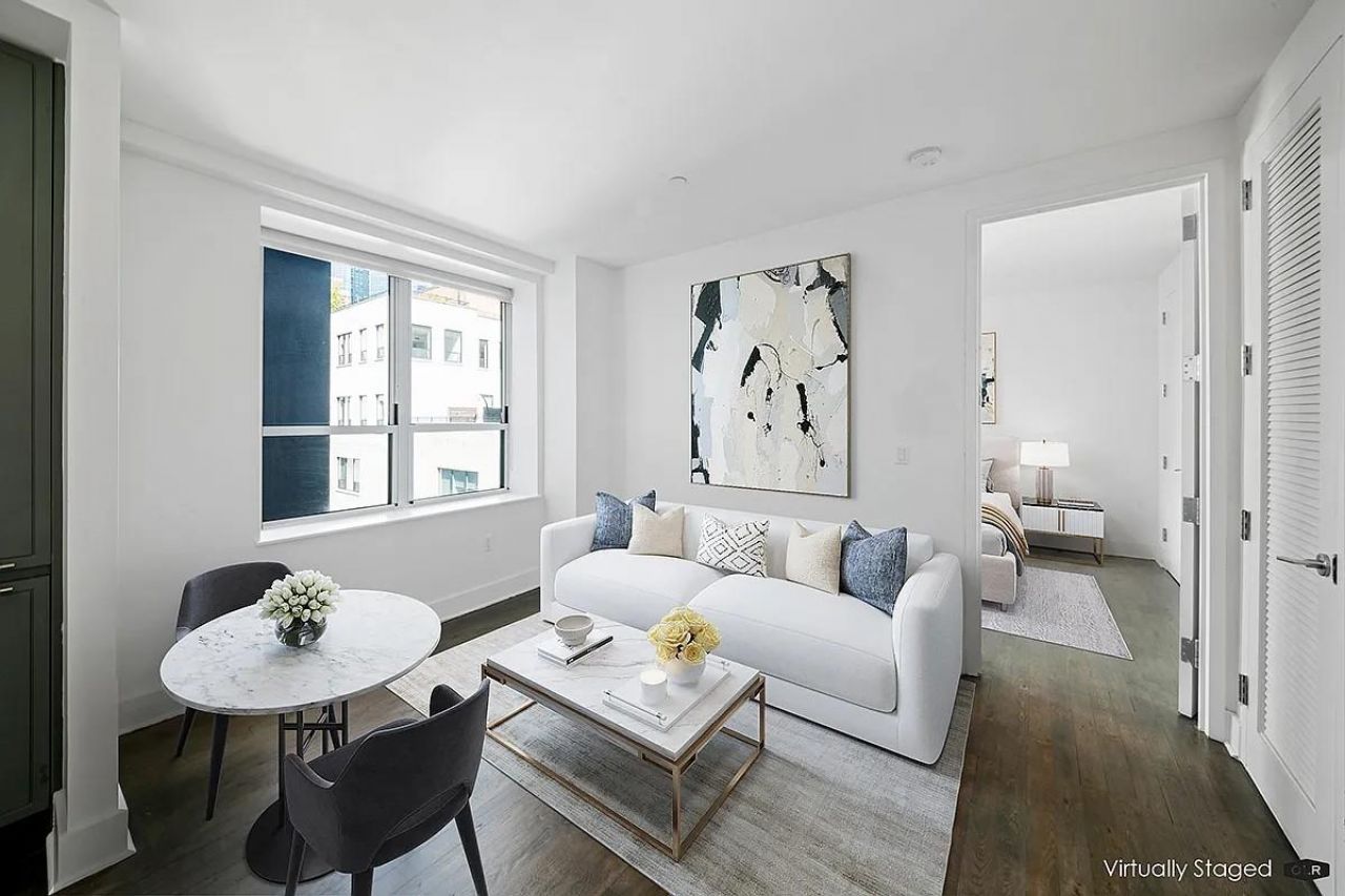 The apartment features modern details ? stained white oak flooring throughout, an expansive windows, Town steel hardware, LG stacked washer & dryer, and smart home technology and individual climate control systems.