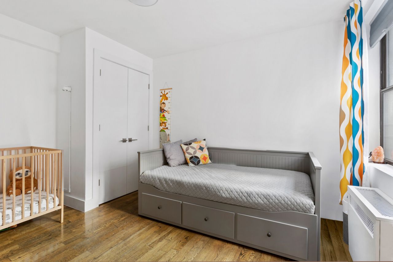 The first bedroom is positioned at the front of the unit, away from the master bedroom, for added privacy. Currently set up as a baby room with a sizable closet and large court facing window.