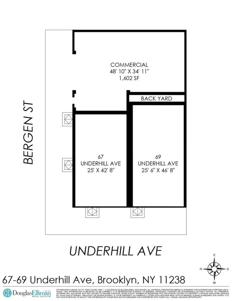 Introducing 67-69 Underhill Avenue, a fully free-market, corner mixed-use property package located in an iconic section of Prospect Heights, ideally positioned between Bergen Street and Saint Marks Avenue. This rare offering comprises two adjoining mixed-use buildings situated on a prominent corner, providing strong street presence, operational flexibility, and long-term value in one of Brooklyn's most established and supply-constrained neighborhoods. The property spans a combined 50.42 ft 78 ft lot and is situated within R6B zoning, offering approximately 897 square feet of unused FAR, presenting clear upside through future reconfiguration, enhancement, or expansion, subject to approvals. Each building features a commercial space at grade with two residential units above, totaling four residential apartments across the assemblage. All residential units are configured as three-bedroom, one-bath layouts, a consistently in-demand unit type within the Prospect Heights rental market. Further enhancing the asset's versatility is an auto body shop with an existing curb cut located off Bergen Street, providing an additional income stream and operational flexibility.