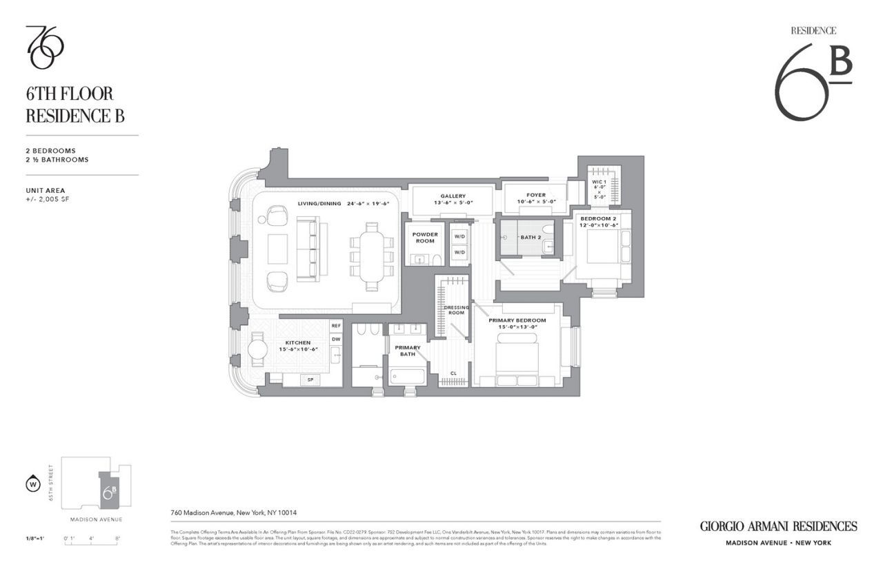 Brand new and never lived in, Residence 6B features bespoke finishes created exclusively for this home. One of only two two-bedroom residences in the building, the apartment offers an elegant 2-bedroom, 2.5-bath layout spanning approximately 2,005 square feet. A semi-private elevator landing opens to a grand entrance gallery clad in Gascogne Beige honed limestone slab flooring, immediately setting a tone of refined sophistication.