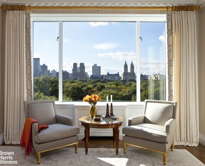 A private elevator landing opens onto an elegant square gallery which leads to a 70 foot enfilade of impressive frontage overlooking Central Park. The entertainment rooms span over 50 feet and include a grand living room, formal dining room and a stunning paneled library. Each of the entertaining rooms has enormous picture windows framing breathtaking views of the Park, as well as west and southern sweeping views of the Manhattan Skyline. Adjacent to the dining room is an amazing 20' x 21' renovated chef's eat-in kitchen with top-of-the-line appliances from Wolf and Miele.The kitchen faces east and enjoys ample morning sunlight, custom cabinetry, and excellent storage space. The oversized breakfast area is perfect for gathering with family and friends, and is ideal for informal entertaining.